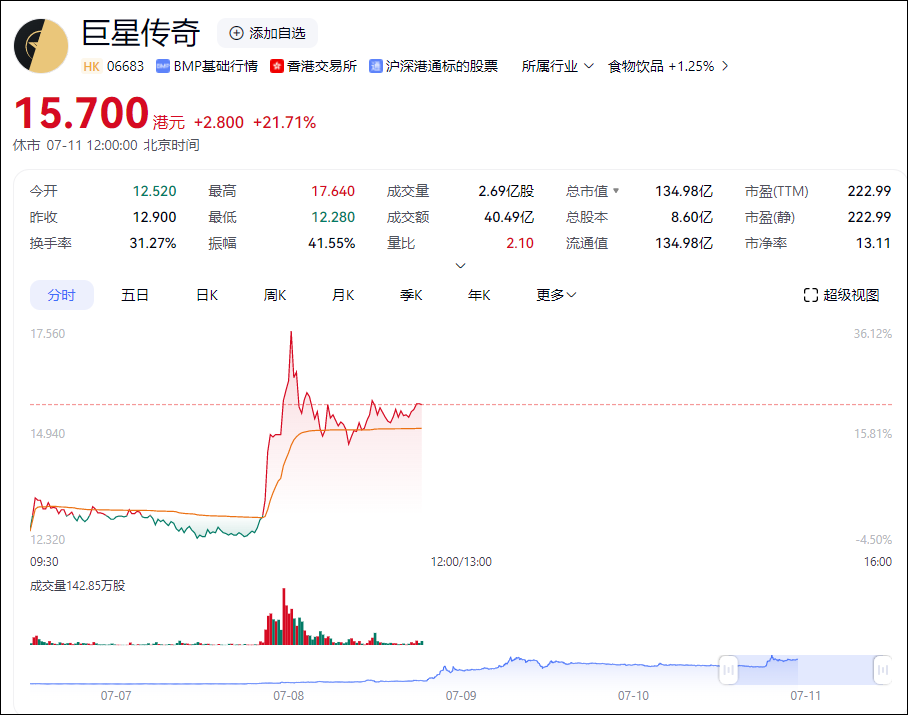 周杰伦发了作品之后,“周杰伦概念股”巨星传奇(6683.hk)股价直线拉升,截至发稿,涨幅达21%。此前三天,股价则收获连续暴涨,累计最大涨幅达204.55%。